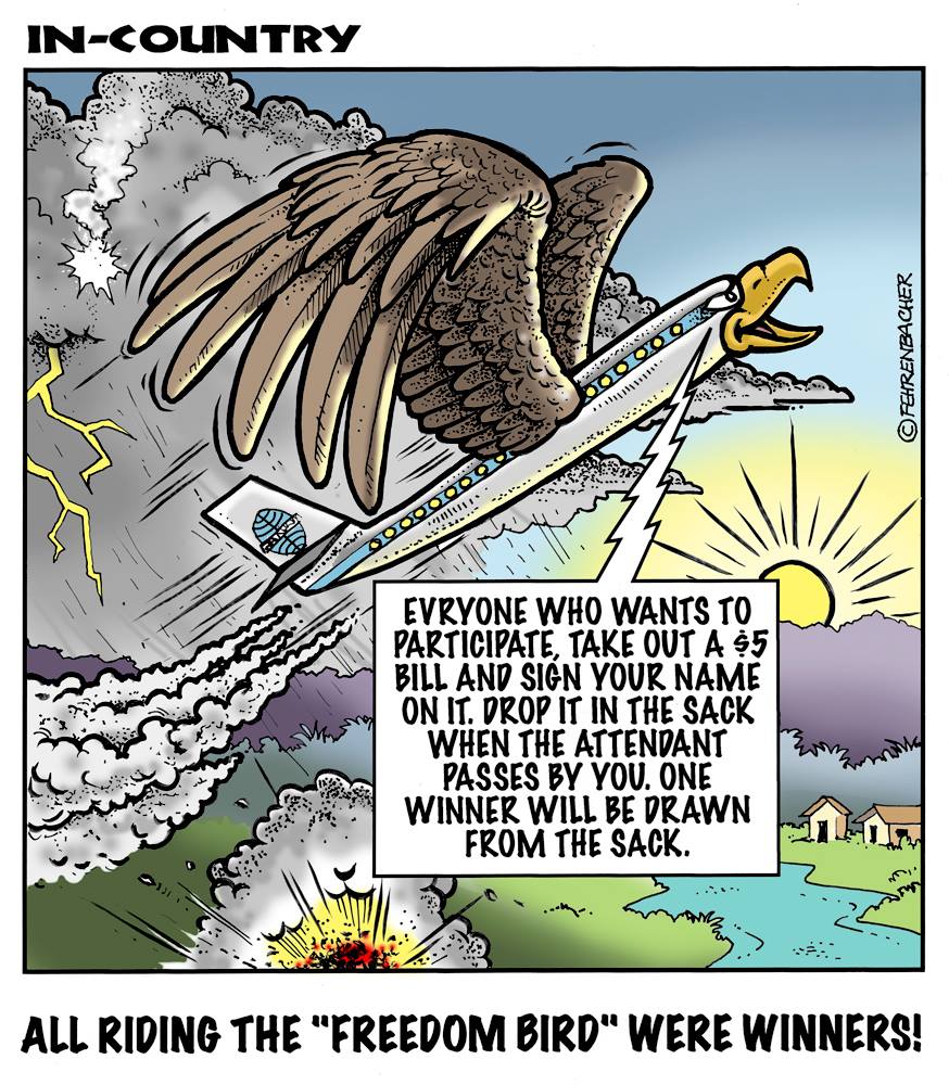 Phil enlisted in the Army in 1965 where he served for years in Vietnam. He became a graphic designer and has worked for the state of Oregon for 26 years. He retired in 2003 and started the Cartoon "In-Country". The cartoons reflect his experiences during his tour of duty in South Vietnam.